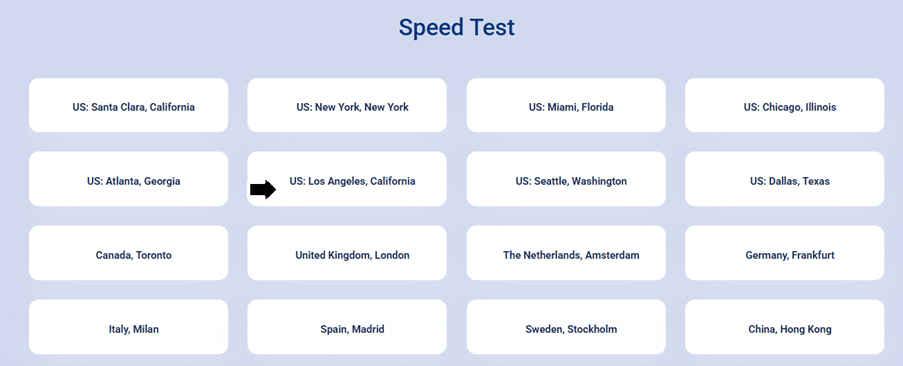 Navigate to the “Speed Test” section and select the data center location you wish to test.