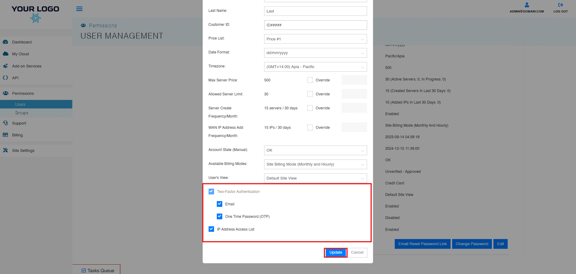 - The Edit User pop-up will appear. At the bottom of the pop-up, you will see two checkboxes, labelled “Two-Factor-Authentication” and “IP Address Access List.” Select your choices, then click Update when finished.
