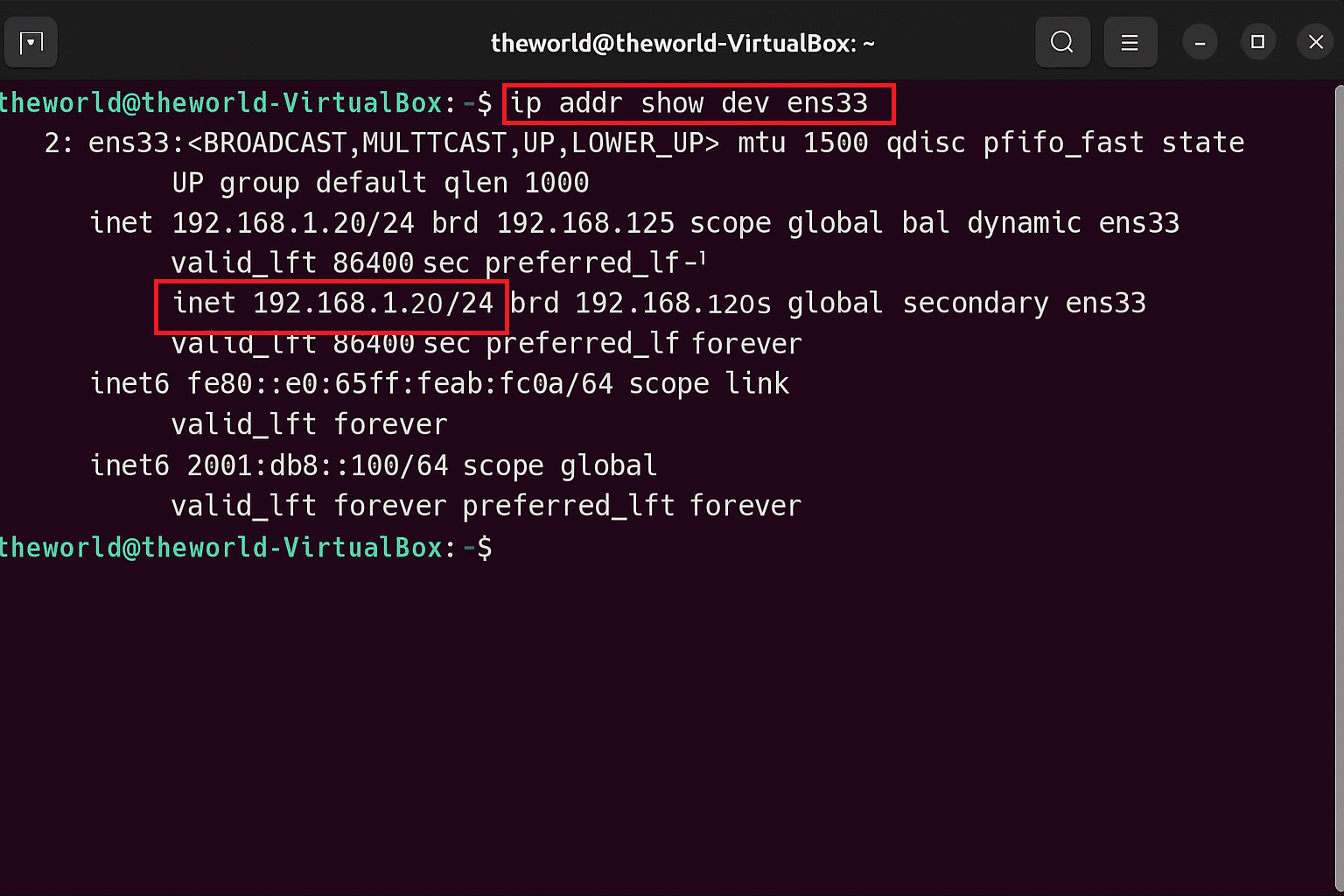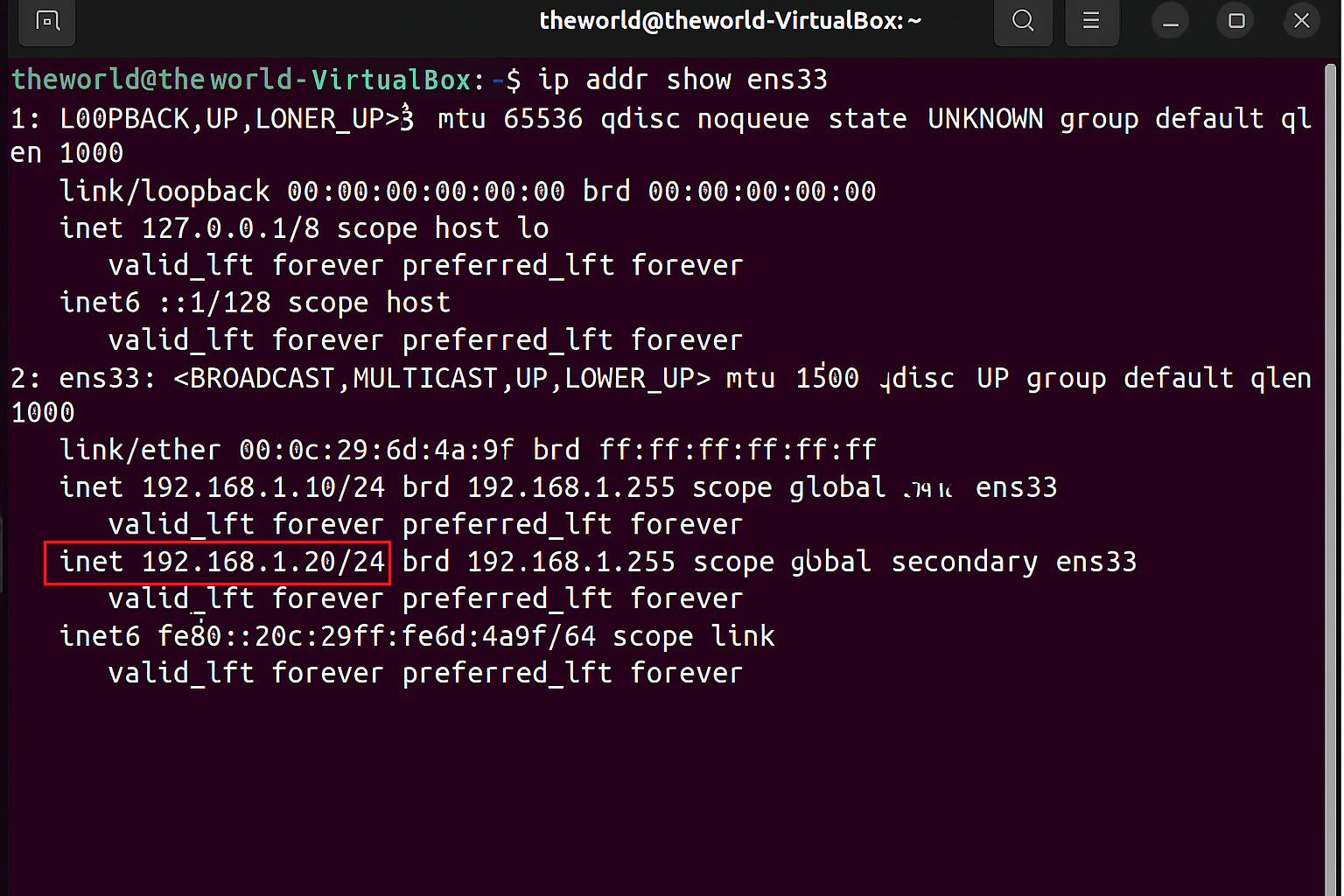 inet 192.168.1.20/24 brd 192.168.1.255 scope global secondary ens33