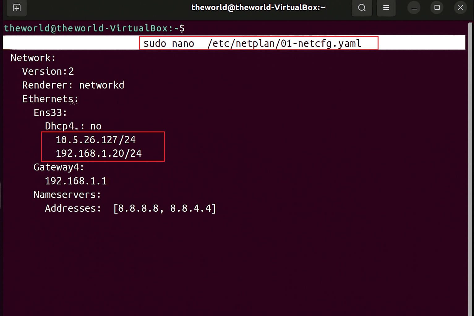Renderer: networkd Ethernets: Ens33: Dhcp4: no Addresses: - 10.5.26.127/24 - 192.168.1.20/24 Gateway4: 192.168.1.1 Nameservers: Addresses: [8.8.8.8, 8.8.4.4]