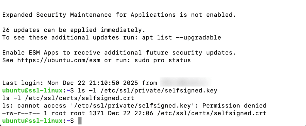 sudo ls -l /etc/ssl/private/selfsigned.keysudo ls -l /etc/ssl/certs/selfsigned.crt